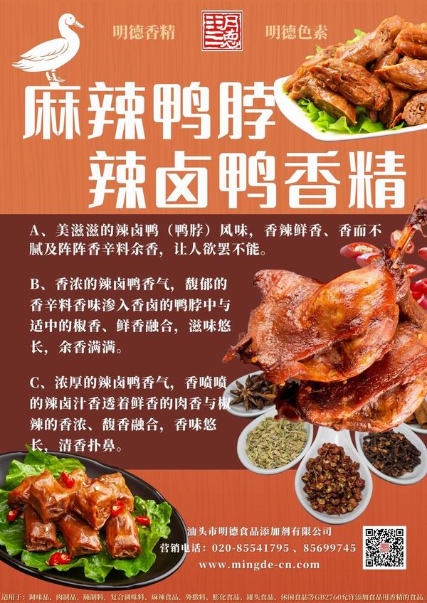 明德食品添加劑 還推出了麻辣鴨脖-辣鹵鴨香精,風味香辣鮮香,伴著陣陣香辛料余香,同時椒辣香、鮮香、肉香融合,香味悠長。