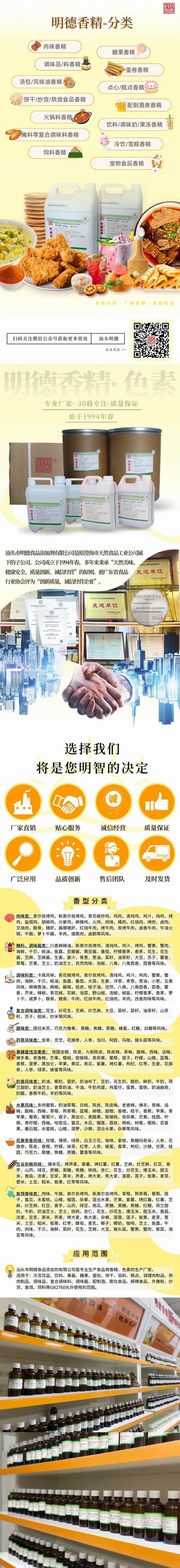 適用范圍:調(diào)味品、肉制品、調(diào)味料、火鍋調(diào)味料、外撒粉、復(fù)合調(diào)味料、膨化食品、麻辣制品、罐頭、休閑小食品等GB2760允許添加食品用香精的食品。