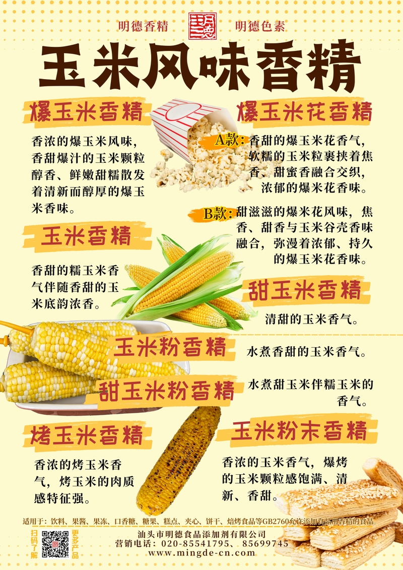 汕頭市明德食品添加劑有限公司推出的玉米風味香精系列,覆蓋爆玉米、爆玉米花、烤玉米、糯玉米、甜玉米及粉末型等多種調性。產品風味真實、留香穩(wěn)定,適用于飲品、烘焙、休閑零食、糖果及復合調味等B端應用,幫助工廠快速打造具有記憶點的玉米風味。